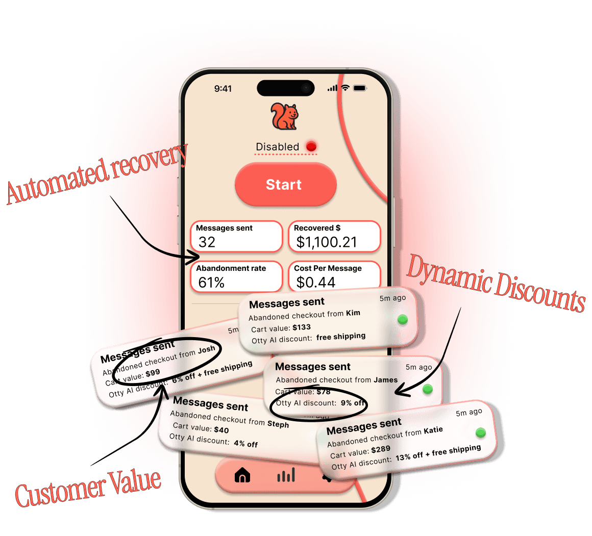 Within minutes. Once you set your offers and max discounts, Otty AI instantly starts analyzing abandoned carts and sending automated recovery messages.
